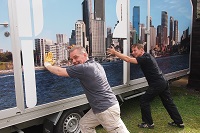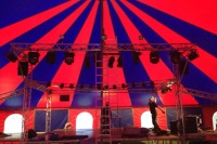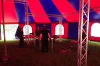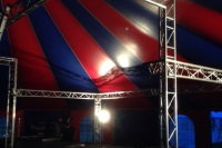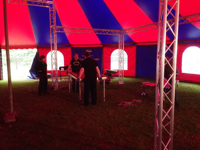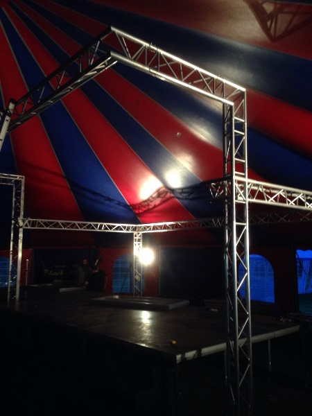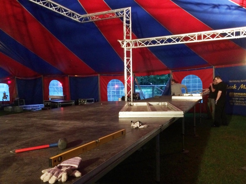 die Bühne aufzubauen. Die Traversen für die Scheinwerfer stehen bereits.